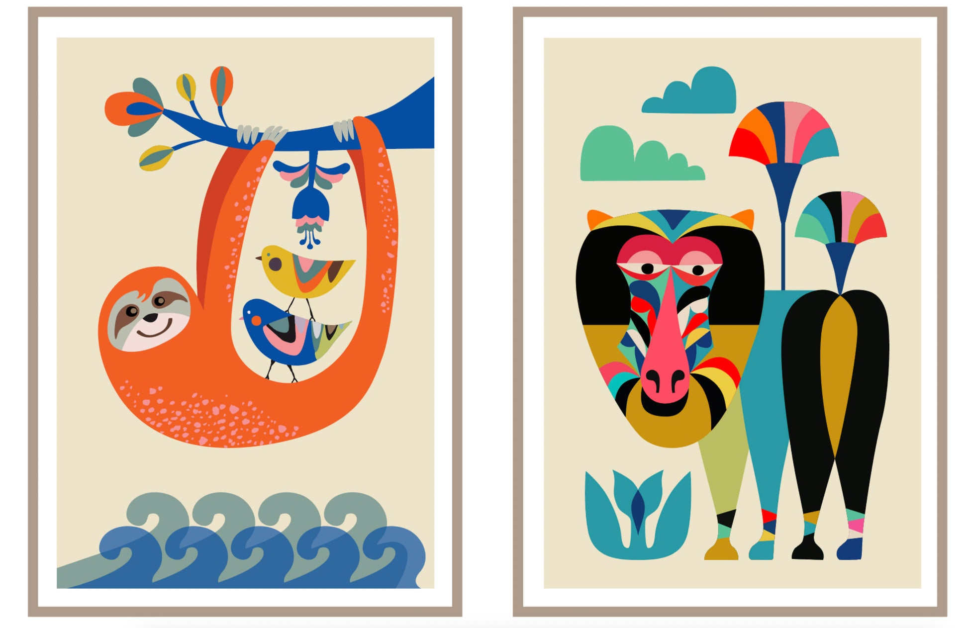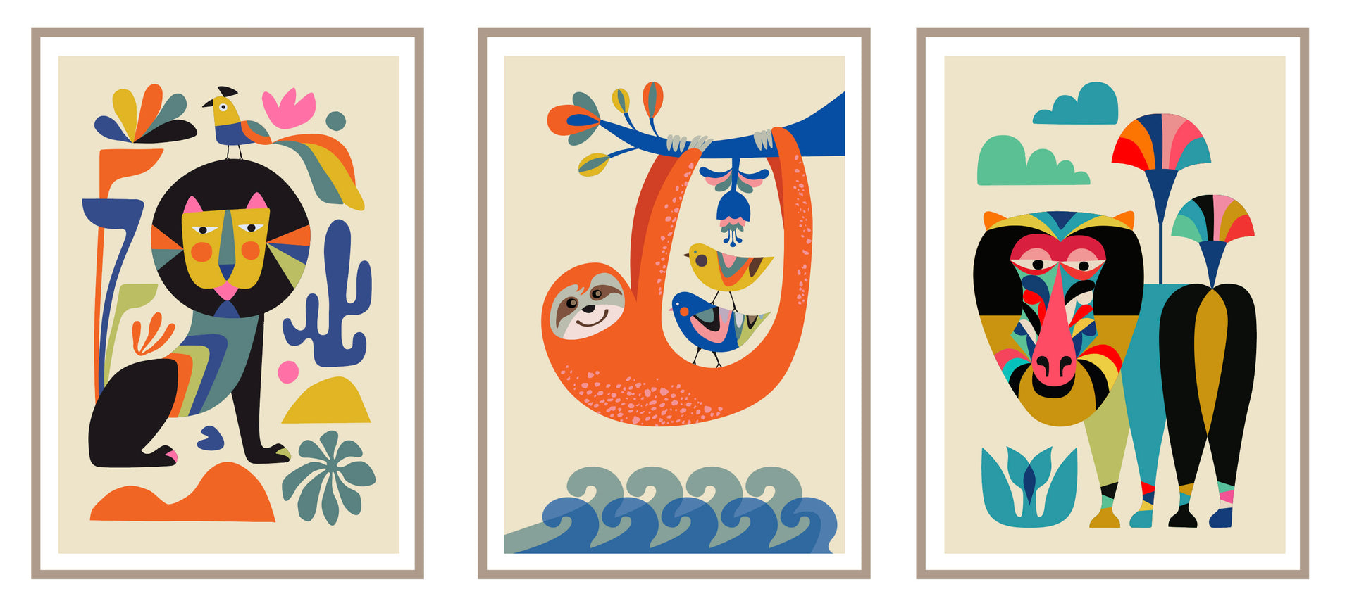 Set of 3 Prints ( Lion, Sloth and Baboon in A3 )
